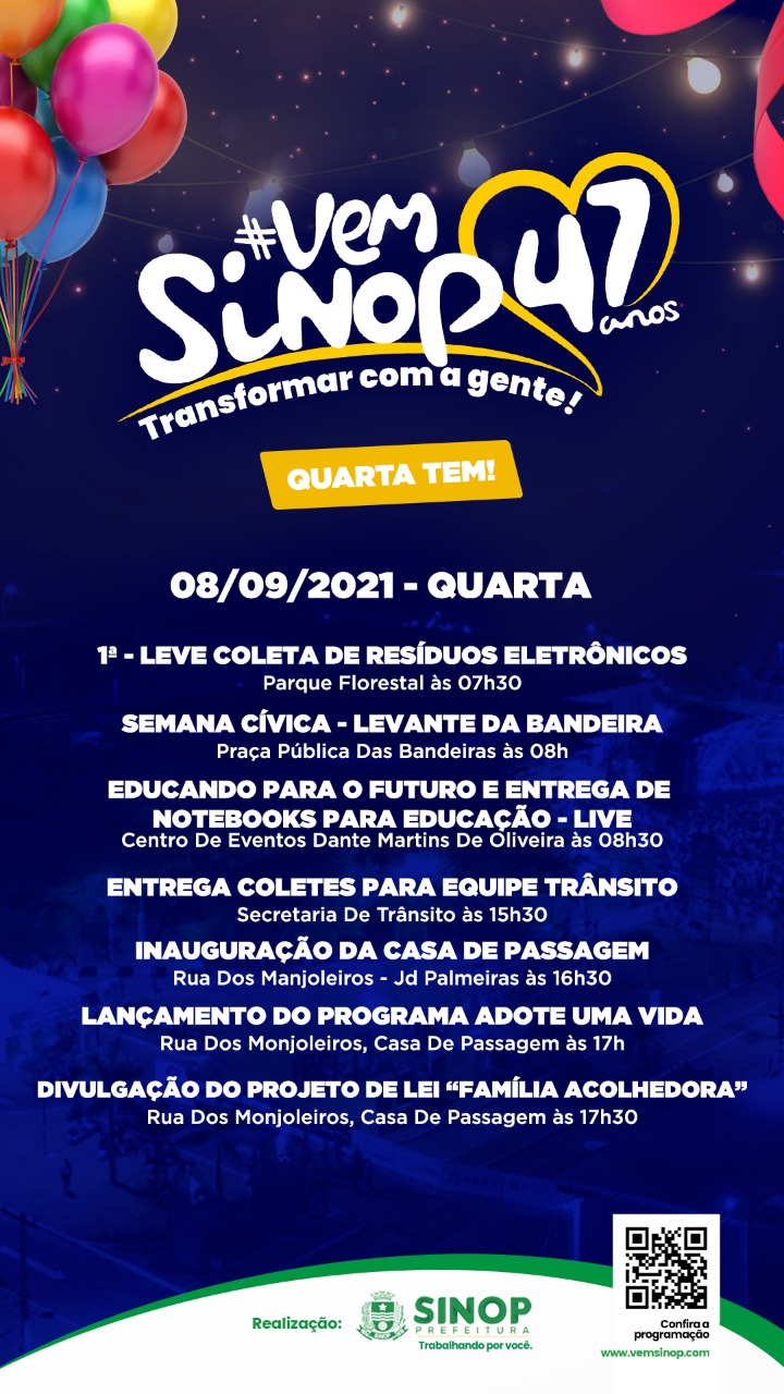Aprovada e sancionada no dia 9 de agosto de 2021 pelo prefeito Roberto Dorner, a Lei nº 2.971/2021 Institui o “Serviço de Acolhimento em Família Acolhedora”, que promove o acolhimento de crianças e adolescentes afastados do convívio familiar, no município de Sinop.