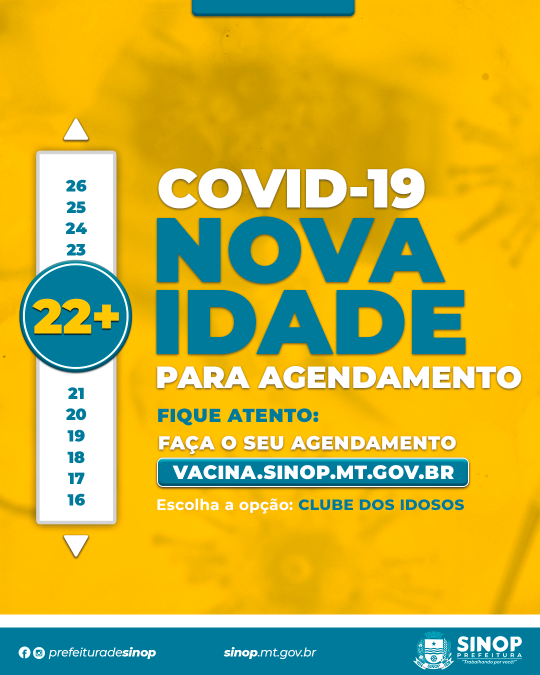 A Prefeitura de Sinop liberou, nesta quinta-feira (19), o agendamento para vacinação de pessoas com 22 anos ou mais. As vagas estão distribuídas entre sábado (21) e sexta-feira (27), na opção Clube dos Idosos e o agendamento pode ser feito no site da Prefeitura ou diretamente no link https://vacina.sinop.mt.gov.br/. A agenda é liberada de maneira gradual, conforme o recebimento de vacinas.