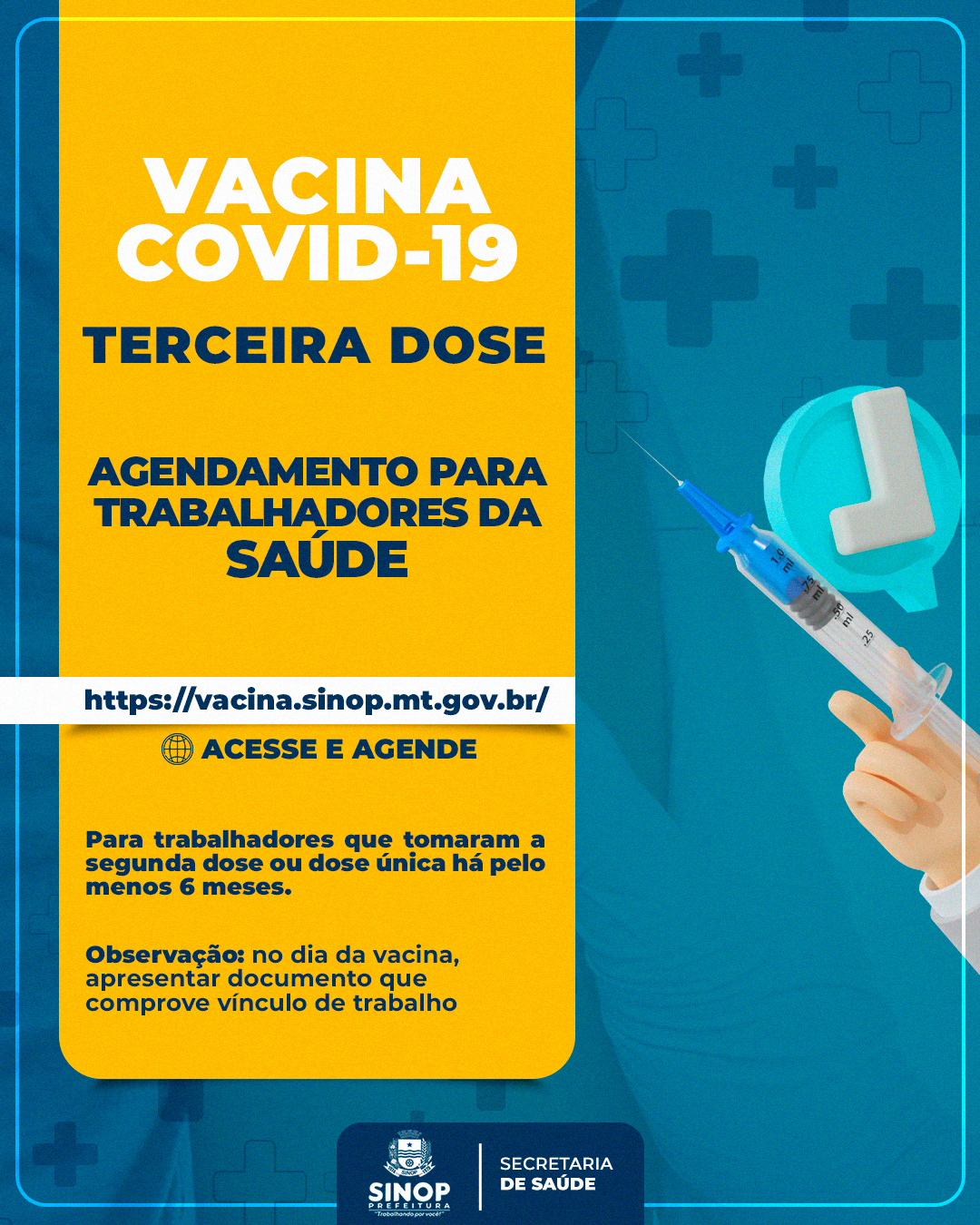 A Secretaria de Saúde de Sinop lançou, nesta quarta-feira (13), agenda para trabalhadores da saúde receberem a terceira dose da vacina contra Covid-19. Os atendimentos para este grupo serão exclusivamente via agendamento no site da Prefeitura de Sinop. A princípio, serão cerca de 3 mil vagas disponibilizadas, considerando o recebimento de doses por parte do Governo Federal. Conforme nota técnica do Ministério da Saúde, a dose de reforço deverá ser administrada em todos os trabalhadores da saúde que receberam a última dose (segunda dose ou dose única) há pelo menos seis meses.