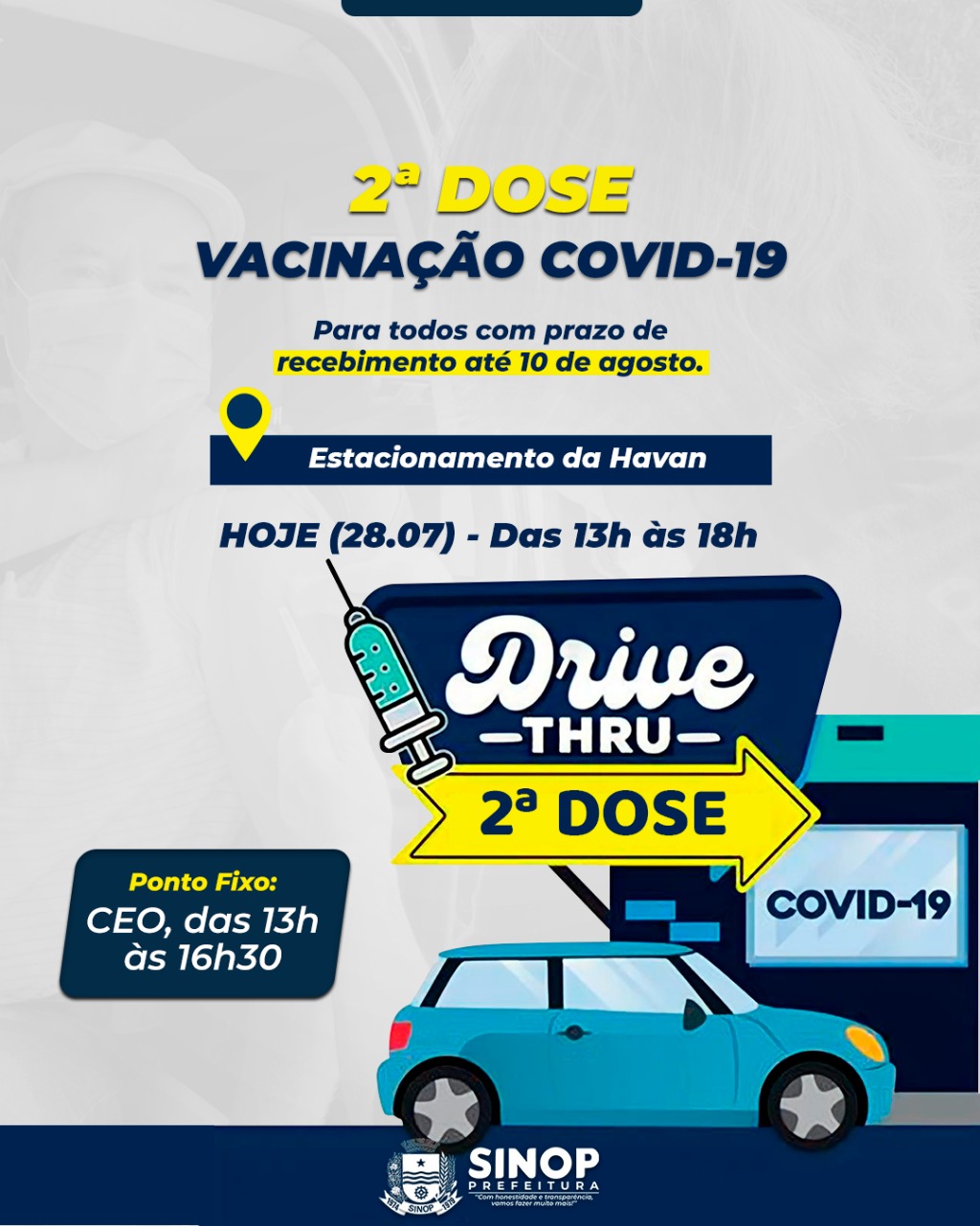 A Secretaria de Saúde de Sinop realiza nesta quarta-feira (28) um drive-thru para imunização exclusiva para 2° dose de pessoas que têm a data marcada para tomar a dose até 10 de agosto. O drive-thru acontecerá no estacionamento da Havan próximo a BR-163.
