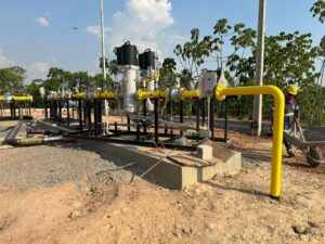 Atualmente, a parte da tubulação está praticamente finalizada e a de assentamento dos dutos já está pronta. A interligação ao ramal da MT Gás foi concluída com sucesso. A construção se encontra agora na fase de instalação do “city gate”, que é uma estação central responsável pela filtragem, regulagem e medição do gás.