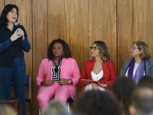 A ministra do Planejamento, Simone Tebet (e), discursa durante encontro com a primeira dama, Janja e ministras no Planalto referentes atividades ao Dia Internacional da Mulher. Foto: José Cruz/Agência Brasil