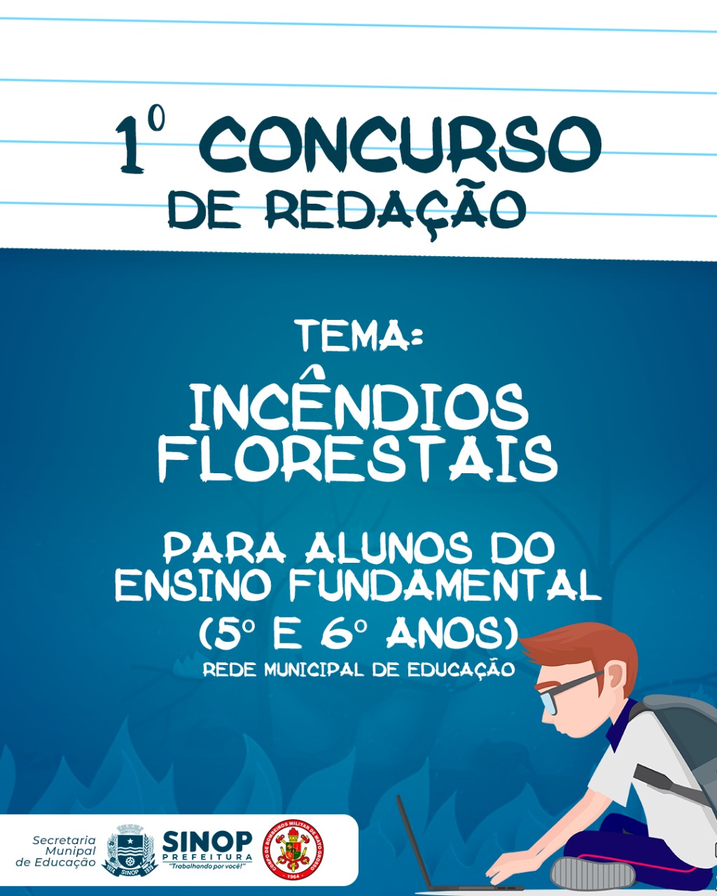 A Secretaria Municipal de Educação, Esporte e Cultura, em parceria com Comando Regional Bombeiro Militar III – 4º Batalhão Militar, lançam o primeiro concurso de redação, com o tema “Incêndios Florestais”, para os alunos do ensino fundamental 5º e 6º anos da rede municipal. O I Concurso de Redação oferecerá premiações para alunos e professores, e tem por objetivo estimular a criatividade e desenvolver o senso crítico, o raciocínio, a leitura e o desenvolvimento da linguagem escrita e artística dos alunos da rede municipal.