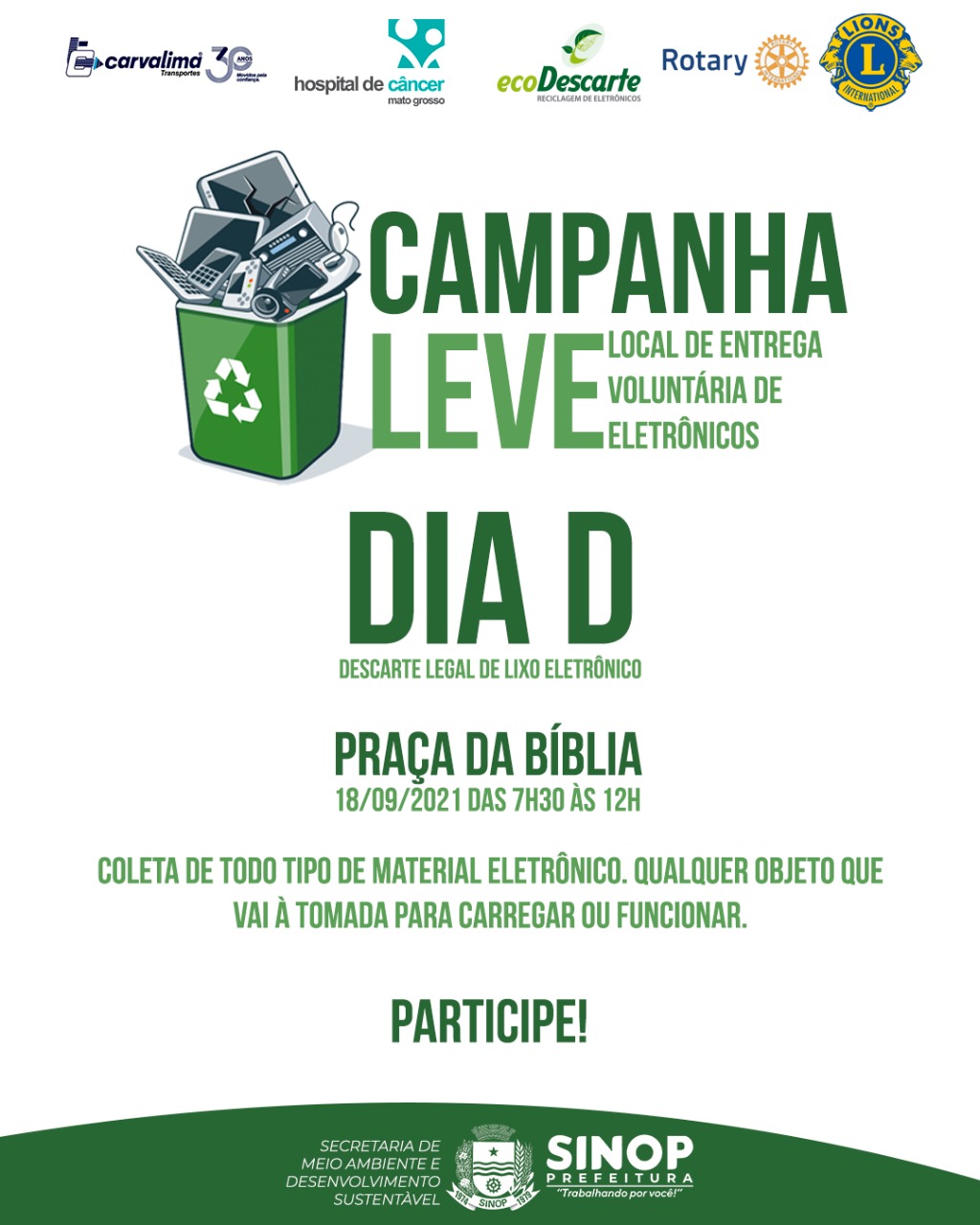 A Secretaria Municipal de Meio Ambiente e Desenvolvimento Sustentável prepara para esse sábado (18), o grande “DIA D” de arrecadação de eletrônicos inservíveis para Campanha Leve (Local de Entrega Voluntária de Eletrônicos). O evento será na Praça da Bíblia com início às 7h30 e término às 12h. A praça fica localizada entre as avenidas das Figueiras, Governador Júlio Campos e Jacarandás, na região central de Sinop.