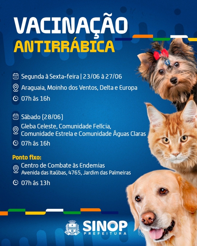 O Centro de Combate às Endemias realiza ação de vacinação antirrábica de gatos e cachorros, em 4 bairros, esta semana. A vacinação é executada no modo, casa a casa, nos bairros Araguaia, Moinho dos Ventos, Delta e Europa. A ação segue até sexta-feira. No sábado (28), será realizada uma mobilização especial na zona rural: Gleba Celeste, Comunidade Felícia, Comunidade Estrela e Comunidade Águas Claras.