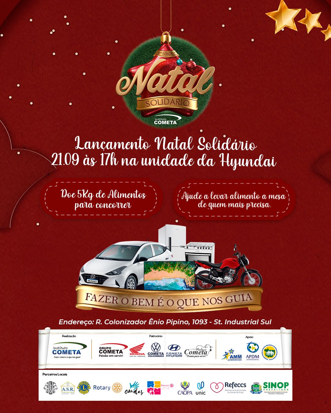 A Prefeitura de Sinop, por meio da Secretaria de Assistência Social, Trabalho e Habitação, aderiu a Campanha “Natal Solidário 2021”. O projeto realizado pelo Instituto Cometa em parceria com a Associação Para o Desenvolvimento Social dos Municípios (APDM), a Associação Mato-grossense dos Municípios (AMM) e o Colegiado Estadual dos Gestores Municipais de Assistência Social (Coegemas), chega a sua 8ª edição e será lançado nesta terça-feira (21.09) no município de Sinop, às 17h.
