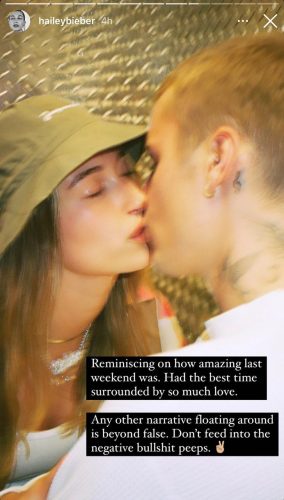 Apesar das pessoas que estavam presente terem saído em defesa de Justin, para os internautas isso não foi o suficiente para cessar o assunto. Nesta quarta-feira (15) a modelo Hailey Bieber usou sua própria conta no instagram para esclarecer o assunto.