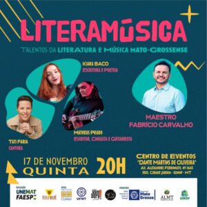 LITERAMÚSICA é um projeto que busca ampliar o acesso aos estudantes à literatura e música mato-grossense atual de forma leve, moderna, participativa e gratuita. Em formato de um programa de televisão com participação dos estudantes na plateia, o Maestro da Orquestra Sinfônica da Universidade Federal de Mato Grosso, Fabrício Carvalho, conversa com escritores e músicos das cidades de Cuiabá, Tangará da Serra, Cáceres e Sinop em troca de conhecimentos, curiosidades, características do trabalho, ampliando, dessa forma, o contato com a nova produção literária e musical do estado. Além da condução do Maestro Fabricio Carvalho, o Literamúsica terá músicos no palco para acompanhar os artistas, o próprio maestro e os estudantes que serão convidados a cantar também em uma grande festa da cultura mato grossense.