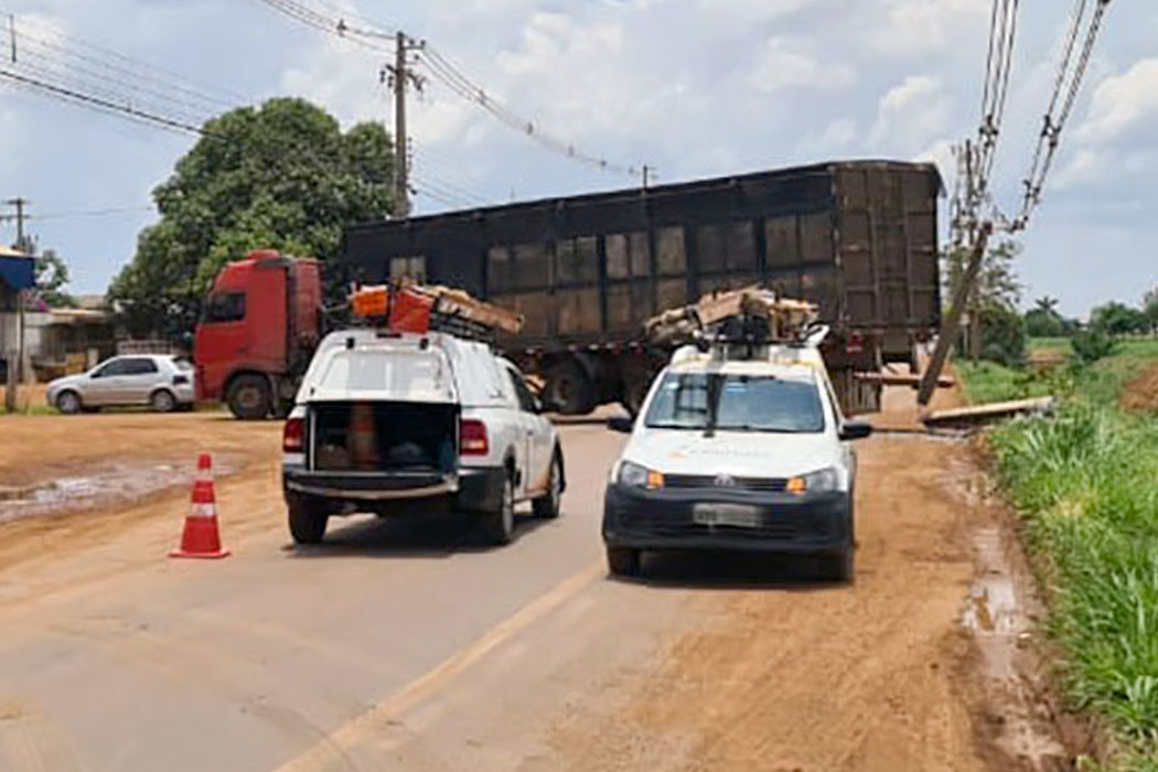 Uma carreta Volvo vermelha (com placas de Lucas do Rio Verde) se envolveu em um acidente na rua João Pedro Moreira de Carvalho, que margeia a BR-163, no perímetro urbano de Sinop. Consta no Boletim de Ocorrências que o veículo atingiu um poste de concreto da rede de energia elétrica da cidade. Apesar da violência do impacto, ninguém ficou ferido.