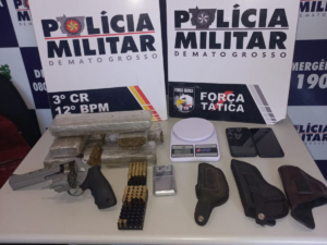 Um homem de 19 anos foi preso por policiais militares da Força Tática do 3º Comando Regional pelos crimes de tráfico de drogas e porte ilegal de arma, na tarde desta segunda-feira (21.08), em Sorriso. Na ação, foram apreendidas uma arma de fogo, 55 munições e tabletes de substância análoga a maconha.