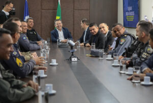 O governador Mauro Mendes recebeu, nesta sexta-feira (26.05), representantes das forças de segurança de Mato Grosso que atuaram na Operação Canguçu, deflagrada contra criminosos que atacaram o município de Confresa no dia 9 de abril. No encontro, Mauro Mendes agradeceu aos policiais pelo resultado da força-tarefa.