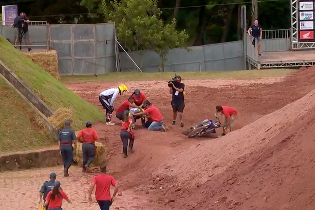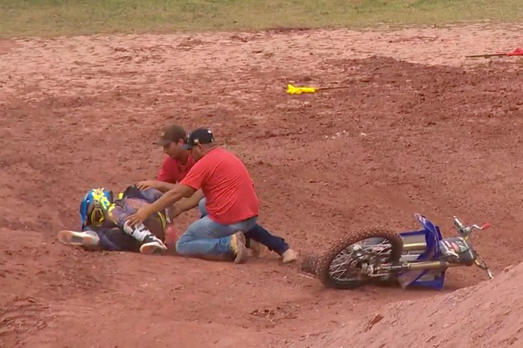 O piloto sinopense de MotoCross Estilo Livre, Gilmar Pereira Flores, o Joaninha, sofreu uma grave queda na manhã deste domingo (2) enquanto executava uma manobra durante a competição Duelo de Motos 2020, em Atibaia (SP). Imediatamente depois do acidente, o piloto foi imobilizado com um colar cervical pela equipe do Corpo de Bombeiros que estava no local e encaminhado para a Santa Casa de Atibaia, para receber atendimento médico.