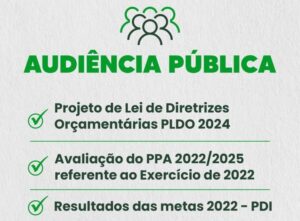 A Prefeitura de Sinop realizará nesta terça-feira (11/04), às 14h, no plenário da Câmara Municipal, a AUDIÊNCIA PÚBLICA de apresentação e discussão do Projeto de Lei de Diretrizes Orçamentárias (PLDO 2024); avaliação do Plano Plurianual (PPA) 2022/2025, referente ao exercício de 2022, além da demonstração dos resultados e metas de 2022 do PDI, conforme determina a Lei Complementar número 101/2000 – Lei de Responsabilidade Fiscal.