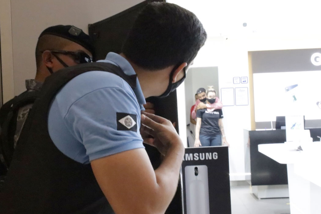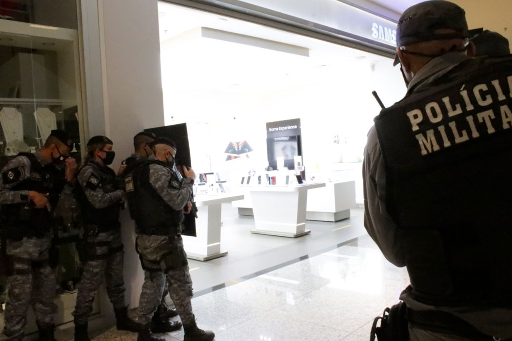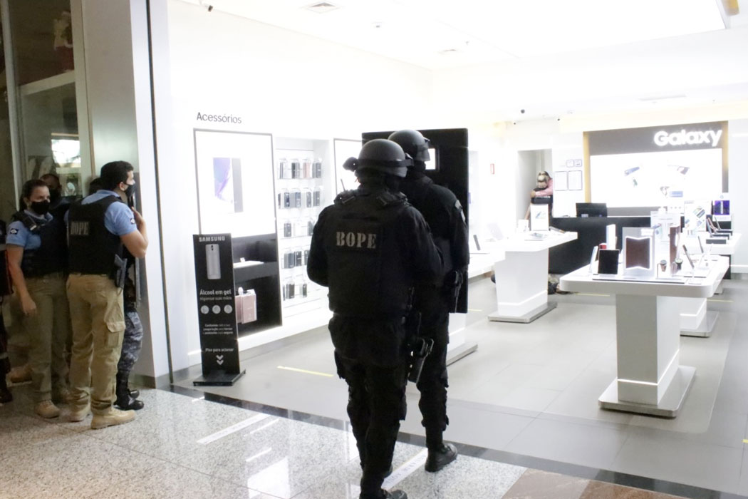 Um segurança do shopping se aproximou da loja para averiguar e confirmar se ocorria um roubo. Nesse momento, a Polícia já havia sido acionada pela coordenação de segurança, uma vez que o alarme disparou. Informações complementares foram repassadas às autoridades policiais a partir da confirmação do segurança.