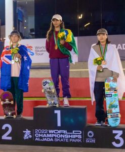 O pódio da disputa feminina foi completado pela segunda colocada Chloe Covell, da Austrália, e por Momiji Nishiya, do Japão. O feito garantiu à brasileira 80 mil pontos no ranking de classificação para os Jogos de 2024, em Paris.