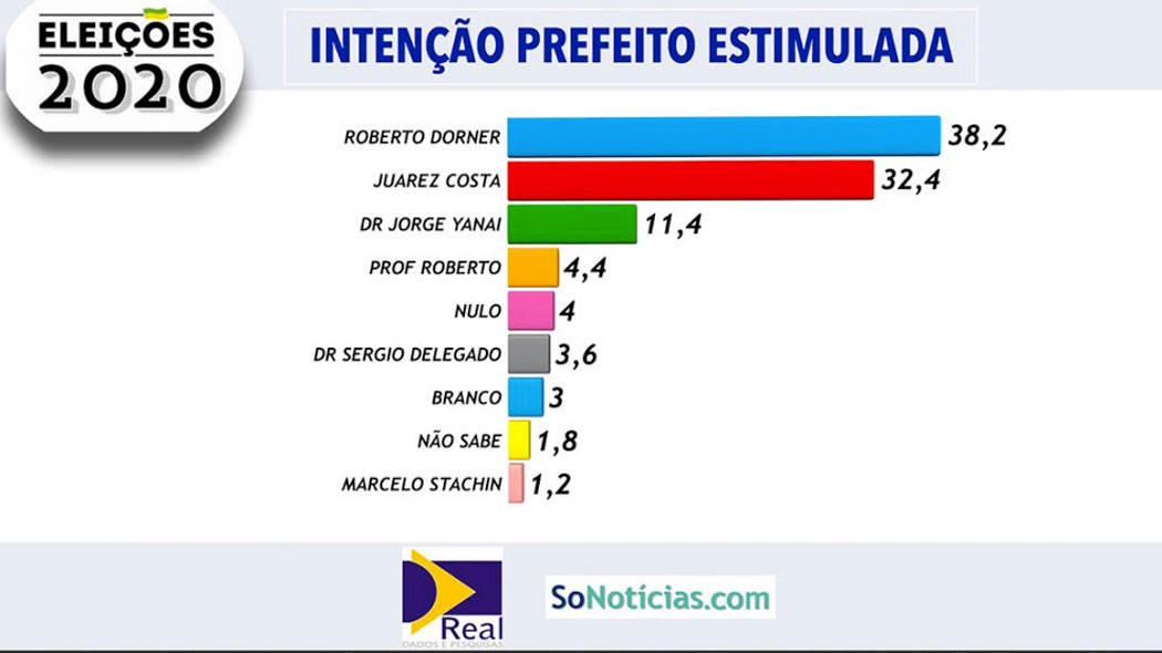 Segundo a nova pesquisa realizada pela Real Dados/Só Notícias, o empresário Roberto Dorner lidera a corrida para o cargo de prefeito em Sinop, com 38,2% das intenções de votos. Em segundo lugar, vem o Deputado Federal Juarez Costa , com 32,4%. O terceiro mais bem colocado é o médico Jorge Yanai, com 11,4%, seguido pelo professor Roberto Arruda, com 4,4%, Sergio Delegado, com 3,6%, e Marcelo Stachin, com 1,2%. O votos nulos contabilizaram 4% e os brancos, 3%. Ainda segundo a pesquisa, 1,8% dos entrevistados não quiseram ou não souberam responder.