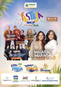 As comemorações dos 49 anos de Sinop se iniciam no próximo dia 02 de setembro até o dia 14, com o Festeja Sinop. São várias atrações culturais, shows nacionais, lançamentos e inaugurações de obras, além de solidariedade e inclusão. A Prefeitura de Sinop programou uma série de atrações, com entrada gratuita, reunindo artistas locais e nacionais, para todos os estilos e gostos.