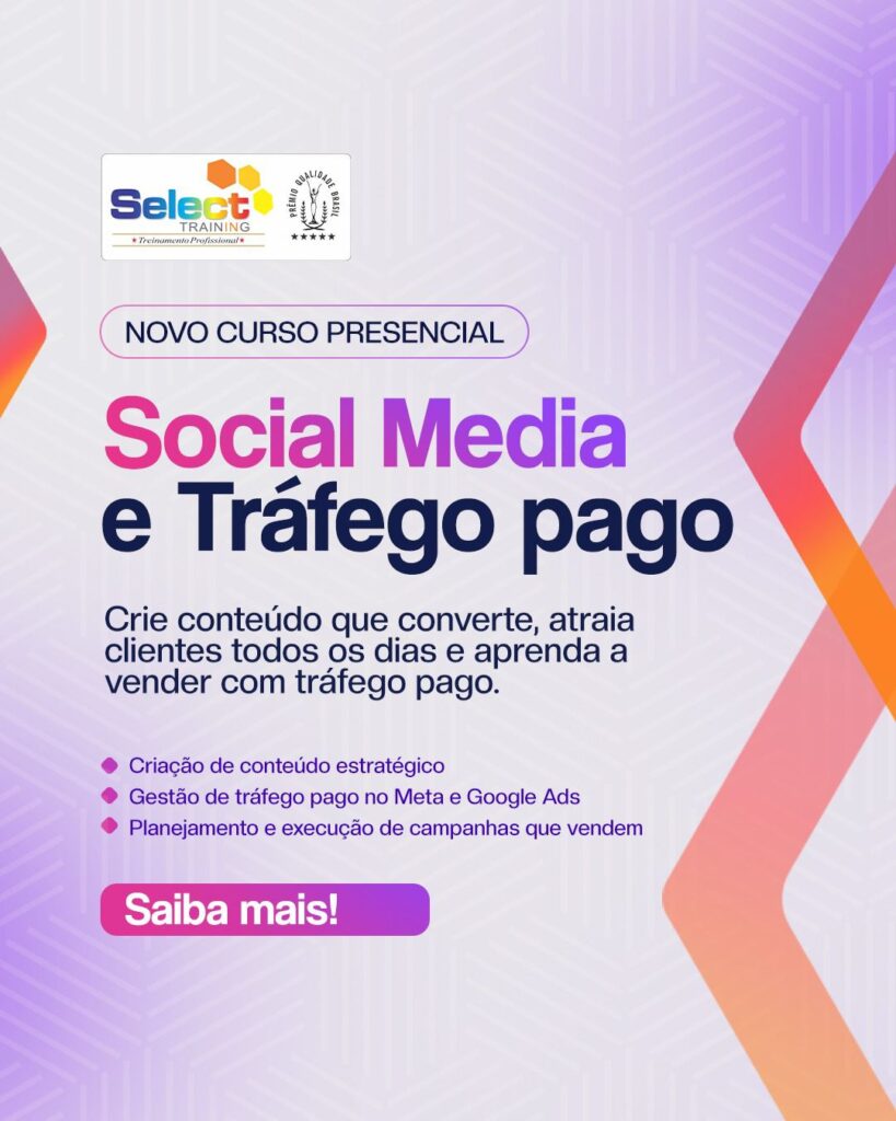 A Select Training, referência em capacitação profissional, acaba de lançar um novo curso presencial voltado para quem deseja se destacar no mercado digital: “Social Media e Tráfego Pago”. A formação tem como objetivo capacitar profissionais e empreendedores na criação de conteúdo estratégico e no uso eficiente da mídia paga para atrair clientes e aumentar as vendas.