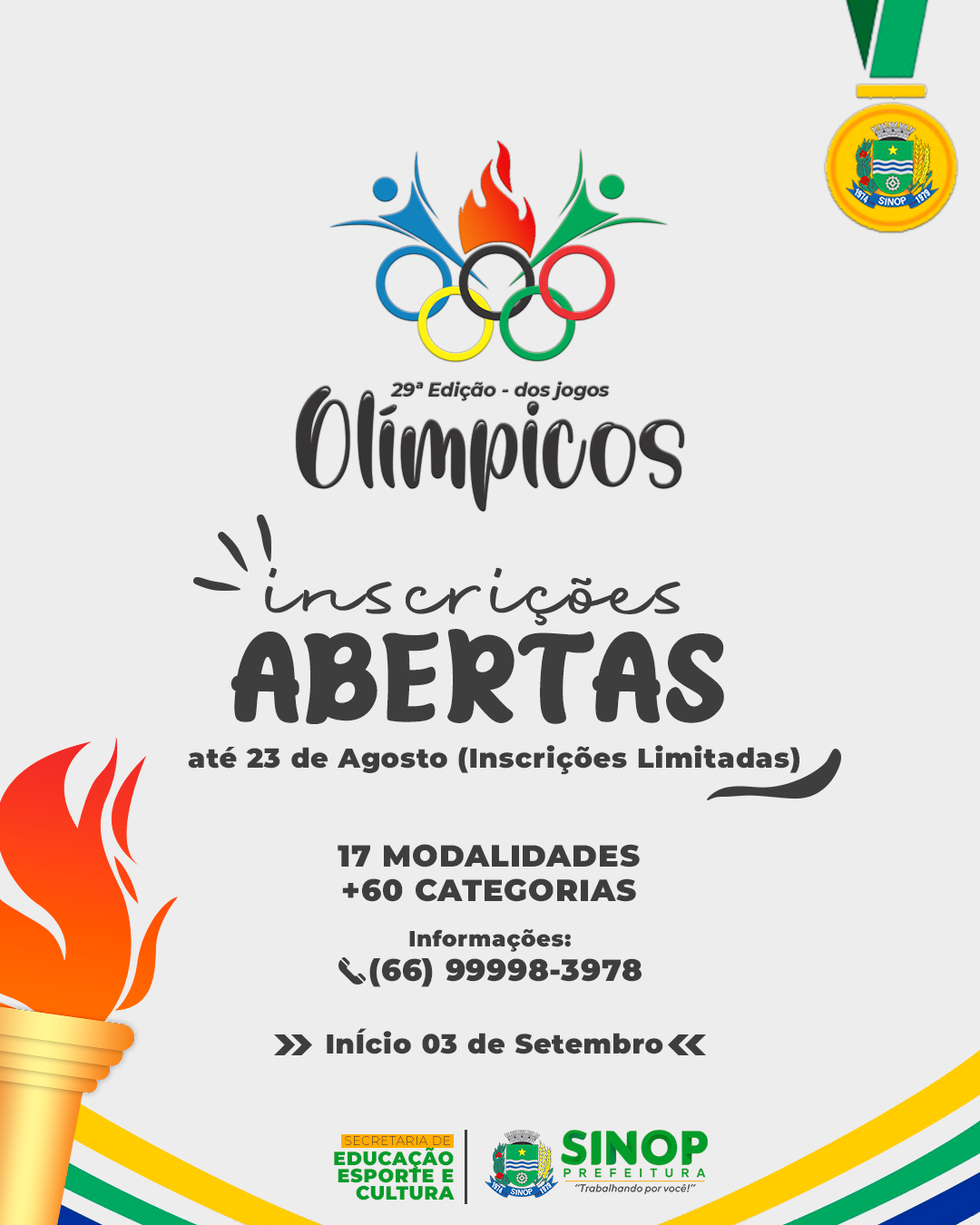 As vagas são limitadas e, mediante preenchimento, não é mais possível assegurar participação. Os Jogos Olímpicos serão abertos no dia 03 de setembro, às 19h30, no Estádio Municipal Gigante do Norte.