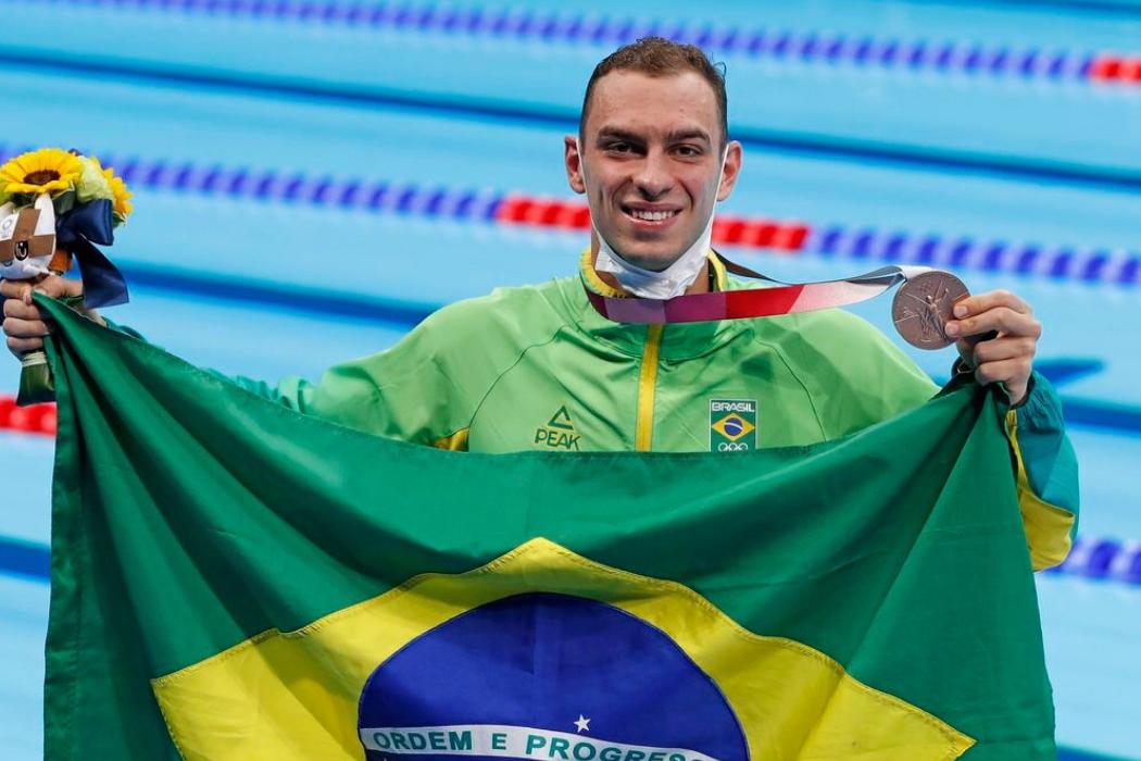 Fernando Scheffer conquistou a primeira medalha da natação brasileira na Olimpíada de Tóquio. A medalha de bronze veio com o tempo de 1min44s66 nos 200 metros estilo livre na madrugada de segunda-feira (26).