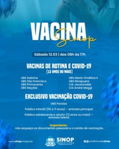 A Secretaria de Saúde de Sinop abre, neste sábado (12), nove unidades de saúde para aplicação de vacinas de rotina (para crianças, jovens e adultos) e, contra Covid-19 para crianças (05 a 11 anos) e adultos. Os atendimentos seguem no formato livre demanda, ou seja, não precisa de agendamento, das 8h às 17h.