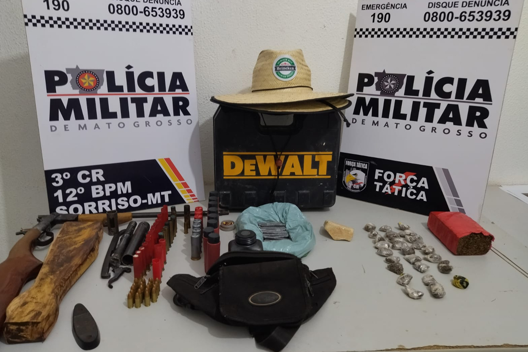 Com os presos, os policiais apreenderam uma espingarda, 29 munições e pólvora, além de vários cartuchos de munições já disparadas. Os militares também encontraram aproximadamente 500 gramas de maconha e 100 gramas de pasta base de cocaína.