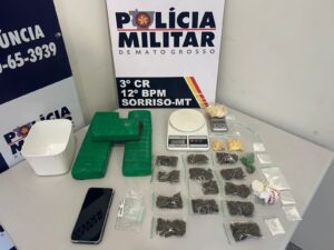 Policiais militares do 12º Batalhão prenderam um homem de 27 anos e apreenderam um adolescente, de 16 anos, por tráfico de drogas, na tarde desta quinta-feira (19.10), em Sorriso. Com a dupla, a PM apreendeu tabletes e porções de substâncias análogas a maconha e cocaína.