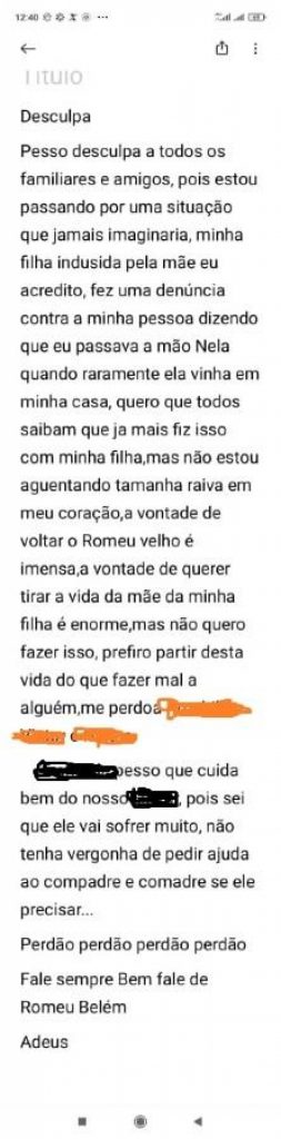 Antes de falecer, Romeu teria enviado um áudio à família afirmando que soube da denúncia feita pela filha, que ele classificou como infundada, e disse que a menina foi induzida pela mãe. Disse ainda que ‘não conseguia lidar com a situação’.