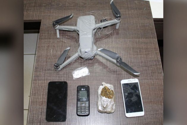 Já na Penitenciária Central do Estado, foi apreendido, por volta das 12h da última quarta-feira (07), um drone que tentava transportar dois aparelhos celulares, três carregadores, um fone de ouvido, quatro chips e um cabo USB.