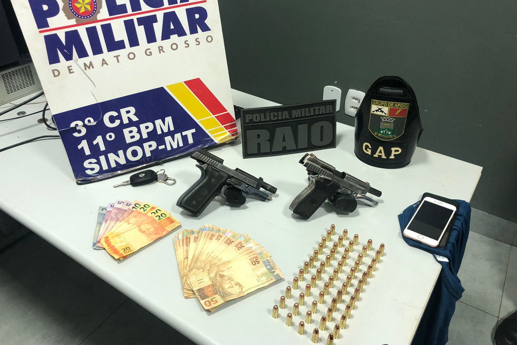 Soldados da Polícia Militar de Sinop prendem dois homens e apreendem um adolescente com armas de fogo, na noite da última quinta-feira (23). Consta no Boletim de Ocorrências que o fato se deu depois que os militares receberam uma denúncia informando que os criminosos estavam em um posto de combustíveis na BR-163.