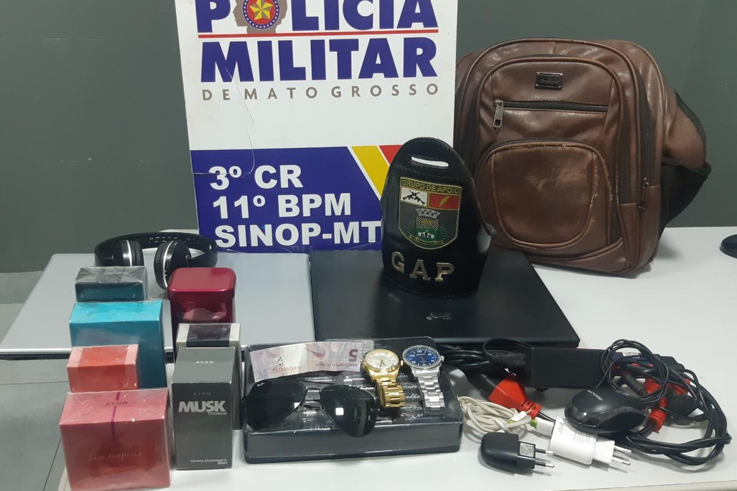 Soldados da Polícia Militar de Sinop prenderam um jovem com vários itens roubados da tarde desta quarta-feira (01). Consta no Boletim de Ocorrências que ele estava com setefrascos de perfumes, relógios, notebooks, óculos e fones de ouvido.
