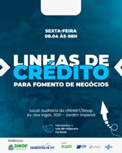 Na próxima sexta-feira (8), a prefeitura de Sinop através da Secretaria de Desenvolvimento Econômico, realizará um workshop presencial em parceria com o Banco de Fomento do Estado (Desenvolve MT), que tratará das Linhas de Crédito oferecidas para o fomento de negócios. A iniciativa é voltada para os empreendedores que desejam ampliar seus negócios.